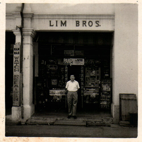 This pic isn't very clear because the source itself is actually smaller than the image you see here. This was my granddad's first bookshop, which he first got in the 1935. It's by the riverside, across the road [on Jalan Laksamana, a half-decent javelin throw from the Malacca Clock Tower] from the bookshop my granddad finally moved to later. Read more about my father and the Lim Brothers bookstore here Previous | Family Index | Photo Index | Next |