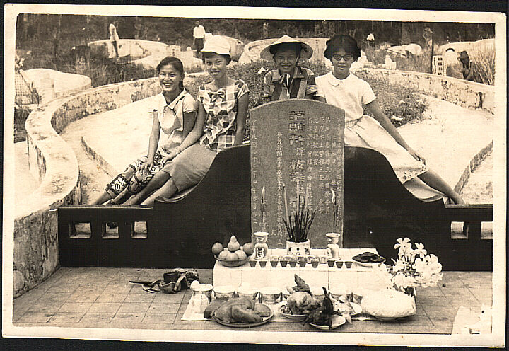 A rather cheery Cheng Meng at Muar Kong-Kong's grave, in the Hainanese Cemetery at Bakri, Muar. From left: Aunty Lucy, Mom, Aunty Margaret, Aunty Alice