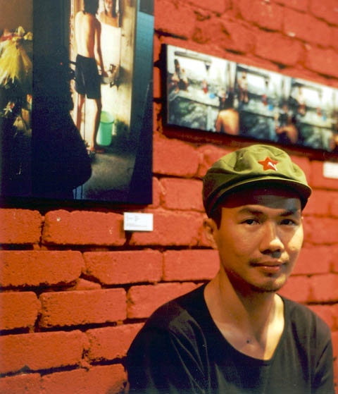 in December 2002. Behind him is the mini-exhibition of my photo sets from the Room To Let shoot.