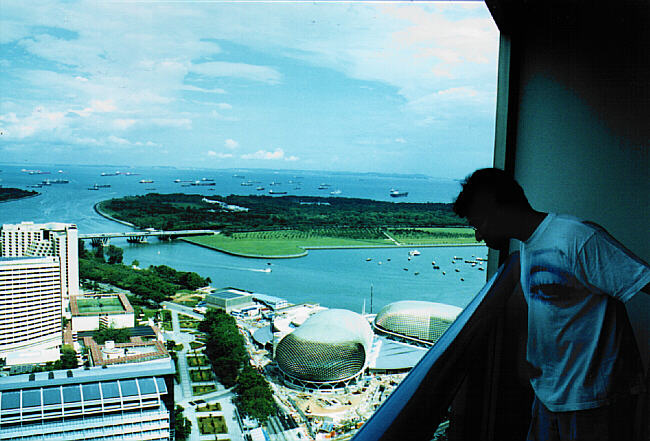 Amir looking - sneering? - at Singapore's yet-to-be-completed (then) arts centre, The Esplanade. He has an interesting nose. [Previous | Next]